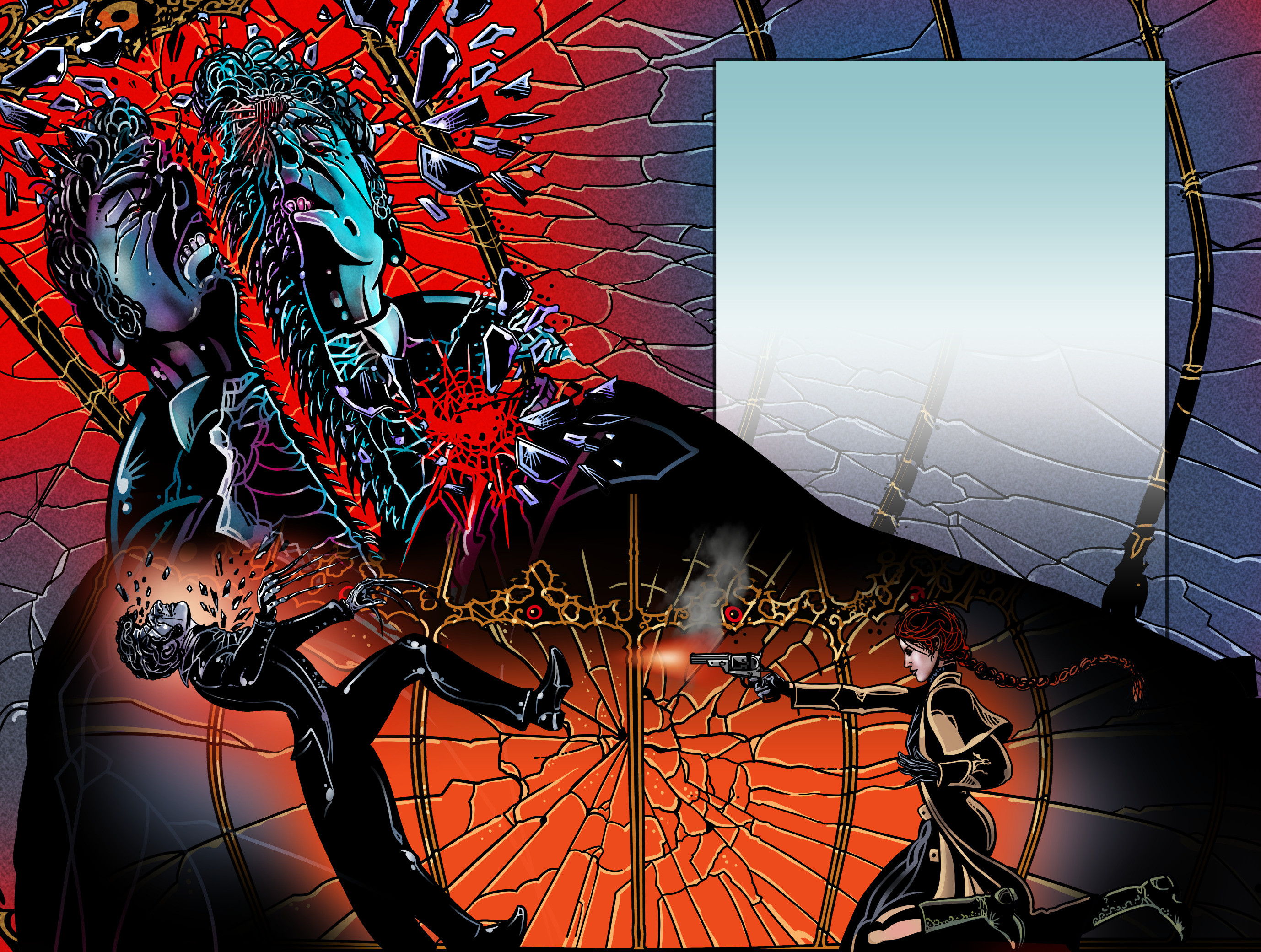 Another page for the “Mercy is Just My Name” illustrated novel. The climactic scene is rendered in a higher contrast style and palette with a superimposition design.